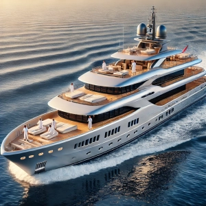 DALL·E 2025-03-14 05.18.04 – A luxurious superyacht on the open sea, featuring a sleek, modern design with high-end finishes, large windows, and multiple decks. The yacht is surro