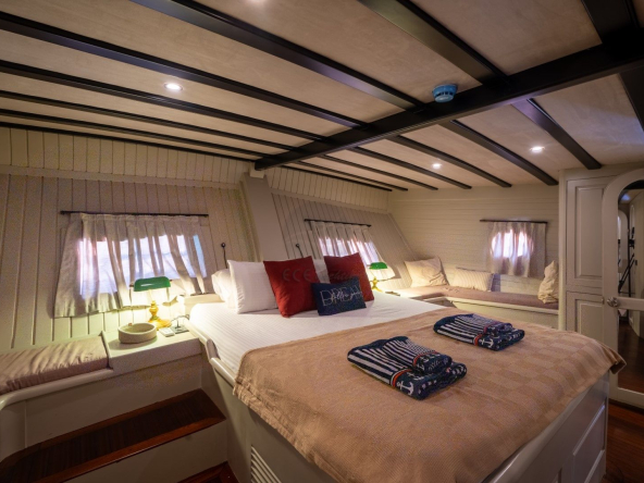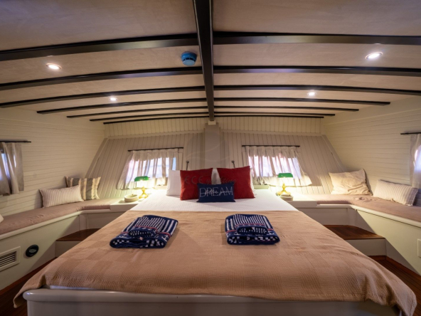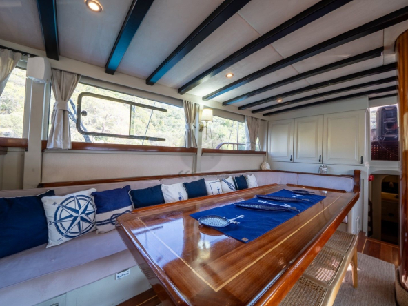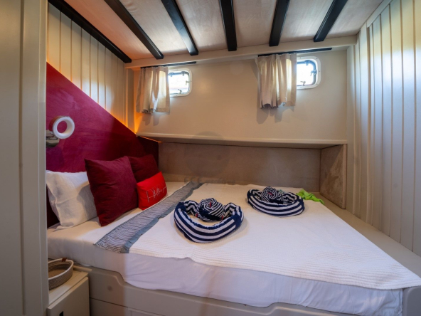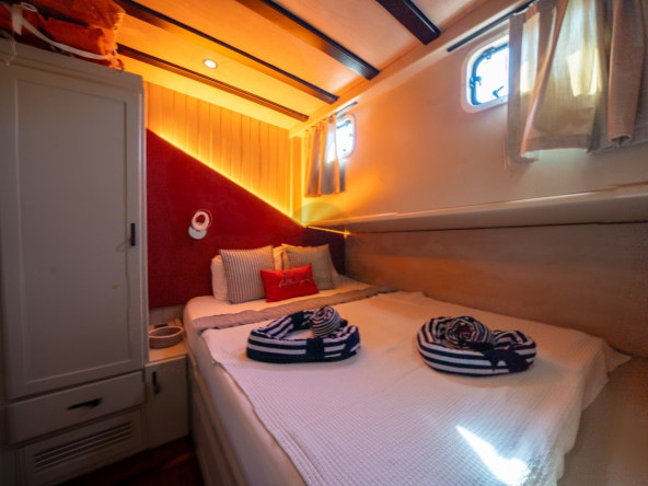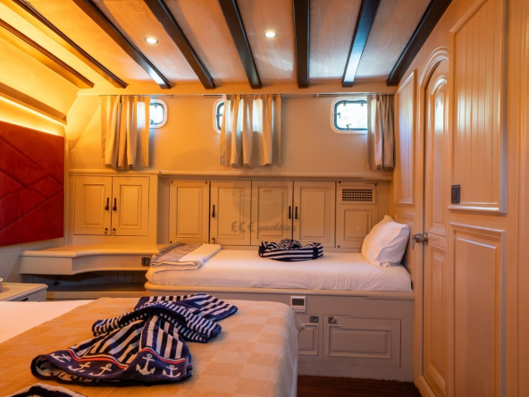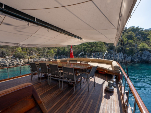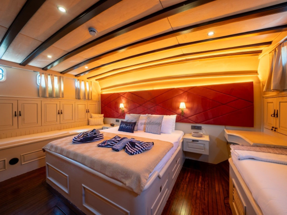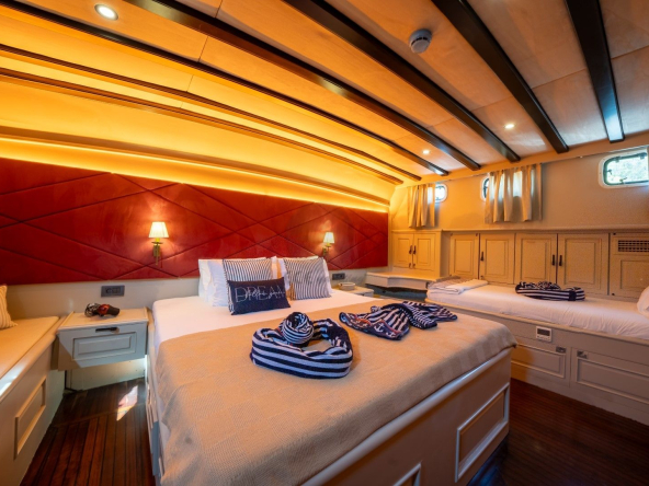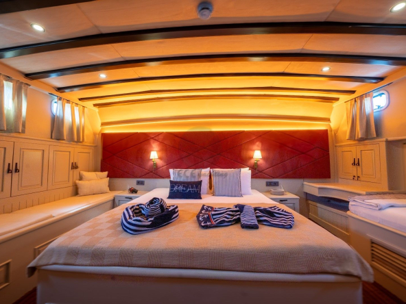 Arielle 1, lüks ve konforu bir araya getiren, yenilenmiş güvertesi ve iç yaşam alanlarıyla öne çıkan bir tekne. 2 master ve 3 double klimalı kabinleri ile misafirlerine rahat ve konforlu bir ortam sunuyor. Kaptan, aşçı ve 2 gemici ile tam donanımlı bir ekip, her anınızda size yardımcı olmak için hazır. Ayrıca, teknede günlük 6-8 saat arası klima hizmeti sunulması, sıcak yaz günlerinde dahi serin bir ortam sağlıyor.