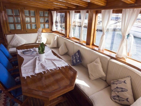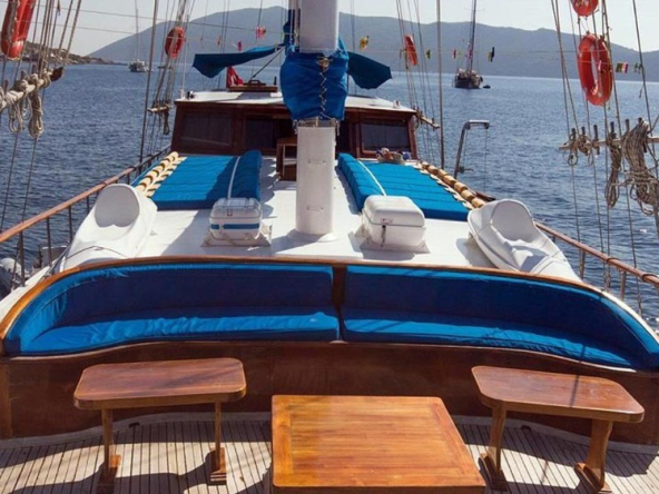 Yatın en dikkat çekici bölümlerinden biri olan geniş arka güverte, büyük minderli oturma alanı ve yemek masasıyla denizin ortasında keyifli vakitler geçirmeniz için tasarlanmıştır. Güneşin tadını çıkarabilir, sevdiklerinizle yemeklerinizi manzara eşliğinde paylaşabilirsiniz.