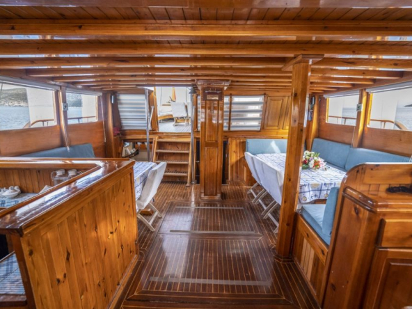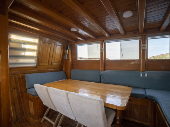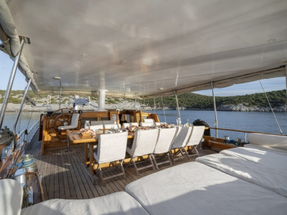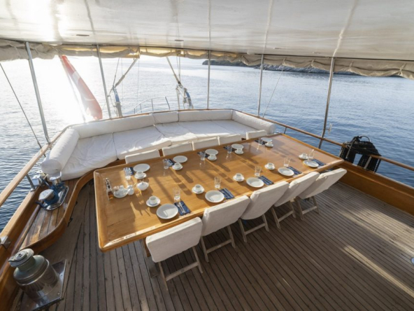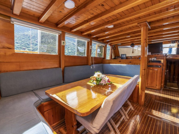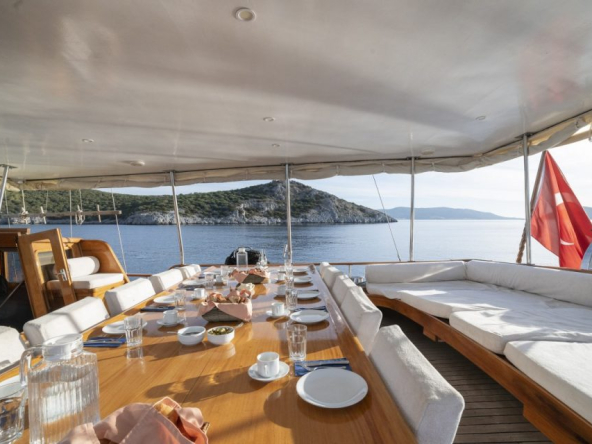 Guletin arka güvertesi, minderli geniş bir oturma alanı ve yemek masası ile açık hava yemekleri için mükemmel bir ortam sağlar. İçeride ise ayrı bir yemek masasına sahip salon ve tam donanımlı bir mutfak bulunur. Deneyimli aşçımız, sizin ve sevdiklerinizin damak zevkine hitap edecek lezzetli yemekler hazırlamak için her an hazırdır.