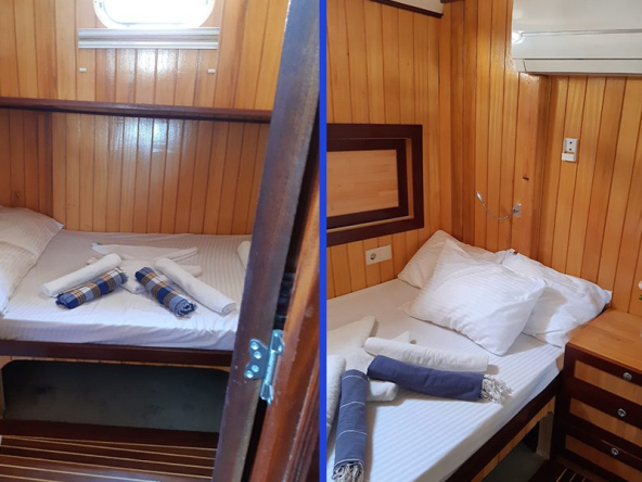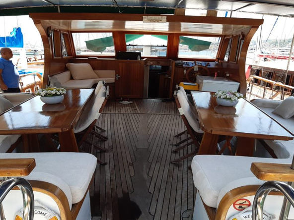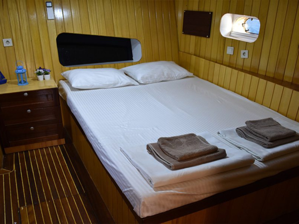 Klimalı 2 Master , 5 Double kabin, duş ve ev tipi tuvalet, Salonda oturma grubu ve yemek masası, Ön güvertede oturma grubu ve güneşlenme minderleri, Kıç güvertede dış mekan yemek masası ve oturma grubu, Kişiler için ayrı kamaralar mürettebat.