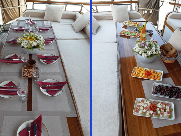 Yat kiralamanız için tam pansiyon konaklama hizmeti sunuyoruz. Standart, lüks veya deluxe menüler arasından seçim yapabilir ve kişi başı günlük 55 ila 85 Euro arasında ödeme yapabilirsiniz.